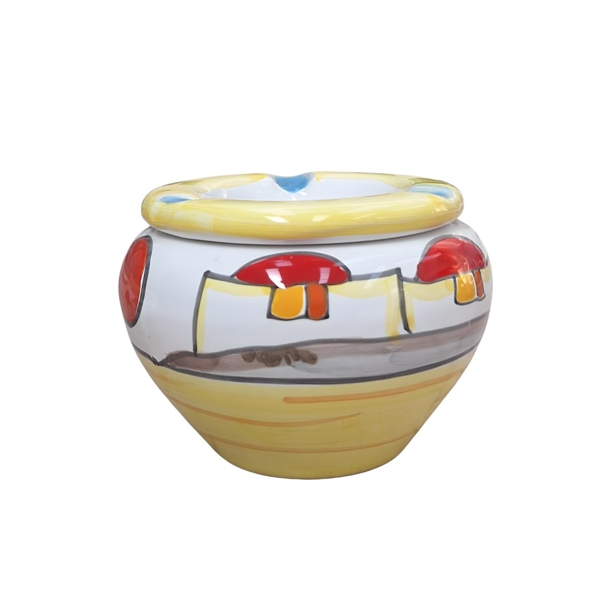 Handcrafted and hand-painted ceramic ashtray, Mangiallegro line, Dammusi Elaborato fantasy. Available in three sizes: 10 cm, 12 cm and 15 cm.