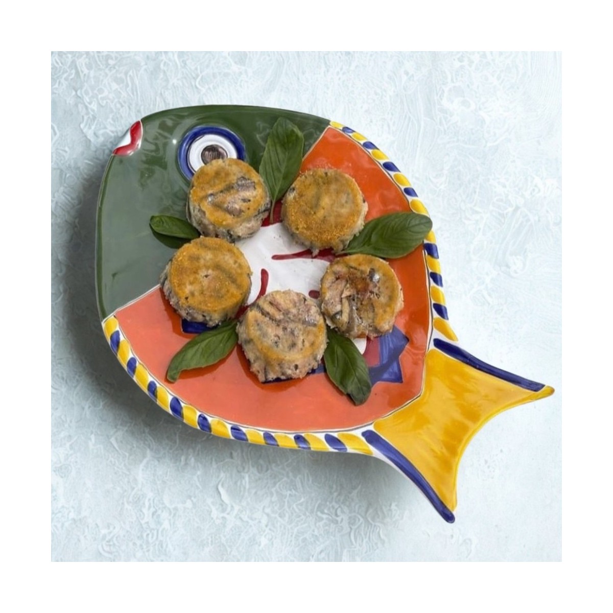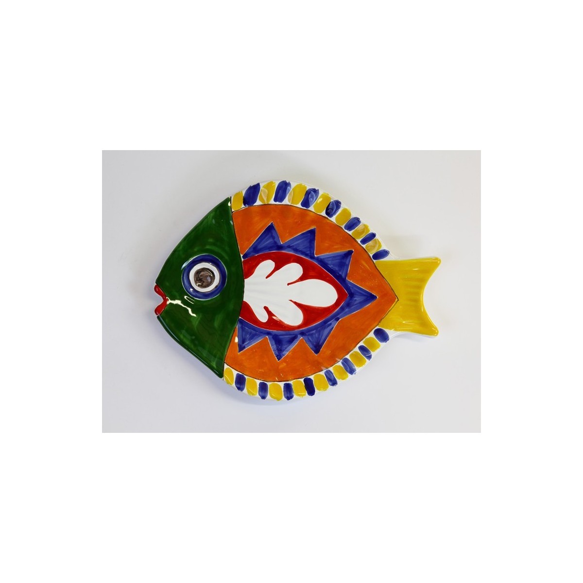 Bottom flat fish-shaped plate made of ceramic and hand-painted. Available in three sizes: 20x16 cm, 25x21 cm, 36x26 cm.