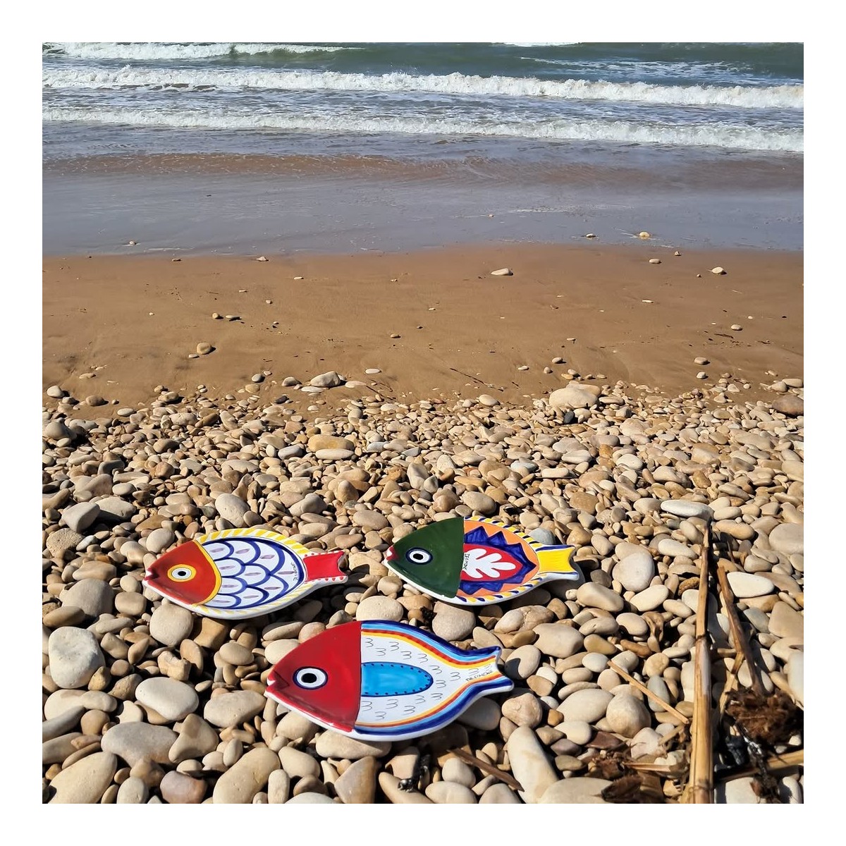 Bottom flat fish-shaped plate made of ceramic and hand-painted. Available in three sizes: 20x16 cm, 25x21 cm, 36x26 cm.