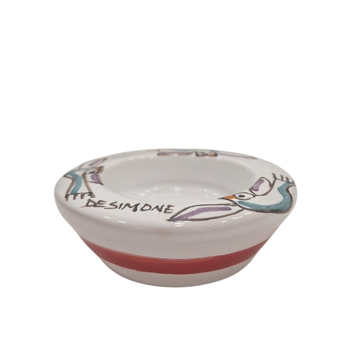 Tealight holder in white ceramic, entirely handmade by our artisans. Its round, compact shape is ideal for holding a tealight and lighting up your table on any occasion, from a casual lunch to a special dinner. The rim is embellished with playful stylised birds in shades of light blue and lilac, with orange details and an elegant red band along the outer edge: an exclusive and lively design, the result of the manual work of craftsmen and artists, that makes this tealight holder an original and refined accessory for any corner of the home.