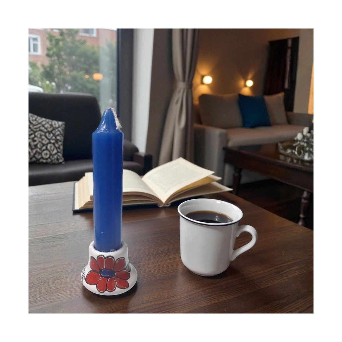 Ceramic candle holder entirely handmade by our artisans. The low, compact shape (3 cm high, 5 cm diameter) with central hole is designed to hold a taper candle, turning it into a small, eye-catching source of light for the table or any corner of the home. The lively, bold decoration features a large daisy with red petals and a blue centre: an iconic motif from the Folk line that makes this candle holder a cheerful, distinctive detail in pure Ceramiche De Simone style.