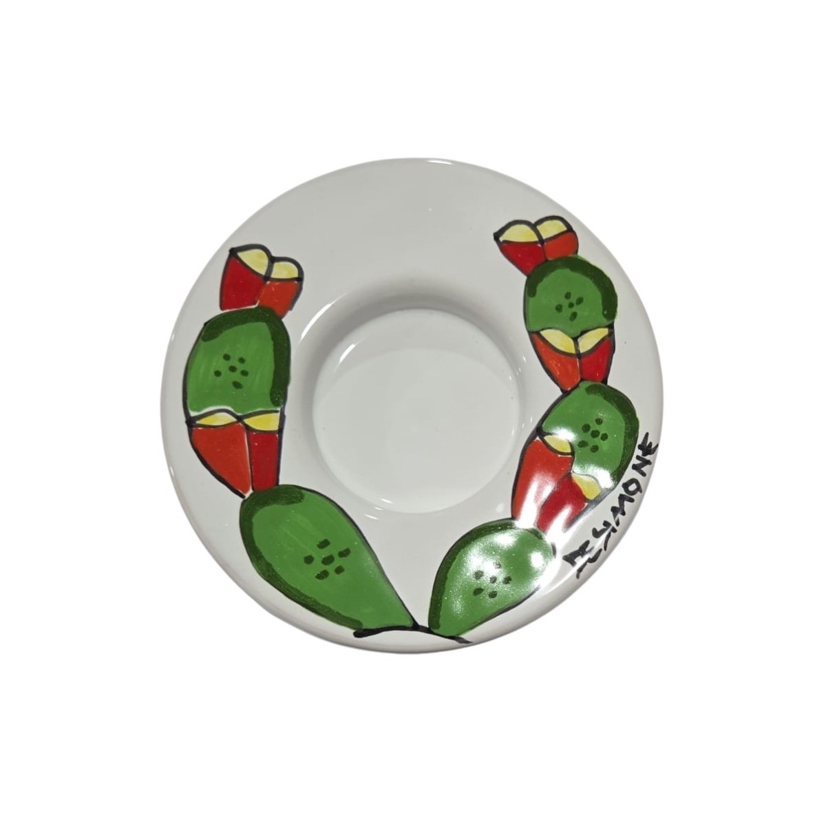Round ceramic tealight holder hand-decorated Folk Prickly Pear