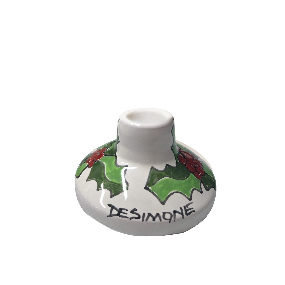 Candle holder in ceramic made entirely by hand by our artisans. The low, rounded shape (5 cm high, 8 cm in diameter) with a central hole is designed to hold a taper candle, becoming an elegant source of light for the table or any corner of the home. The lively, bold decoration alternates large yellow stars with an orange Christmas bauble tied with a red bow: a festive and unmistakable design from the Folk line that makes this candle holder a statement piece in pure Ceramiche De Simone style.