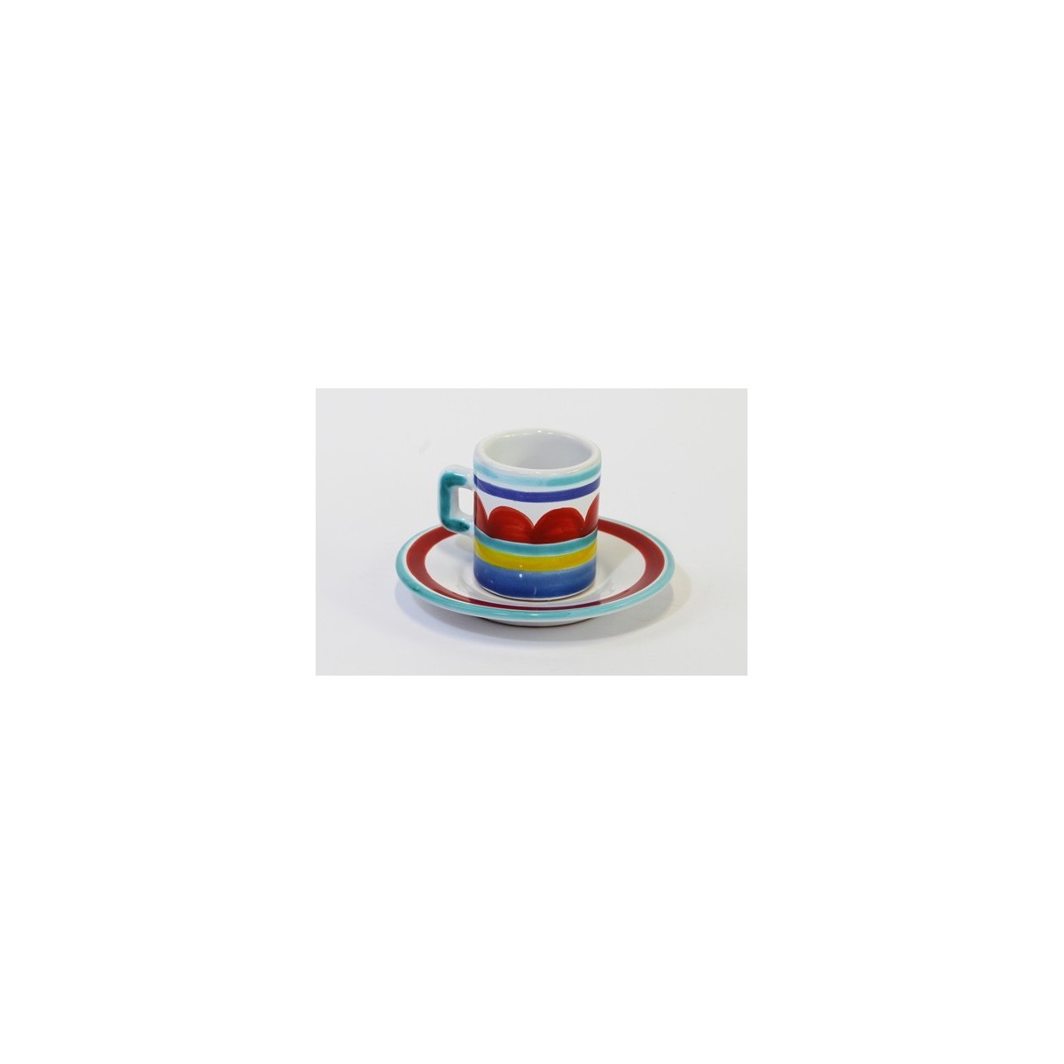 Handmade and hand-painted cylindrical ceramic coffee cup and saucer set from the Mangiallegro line with Sibari pattern.