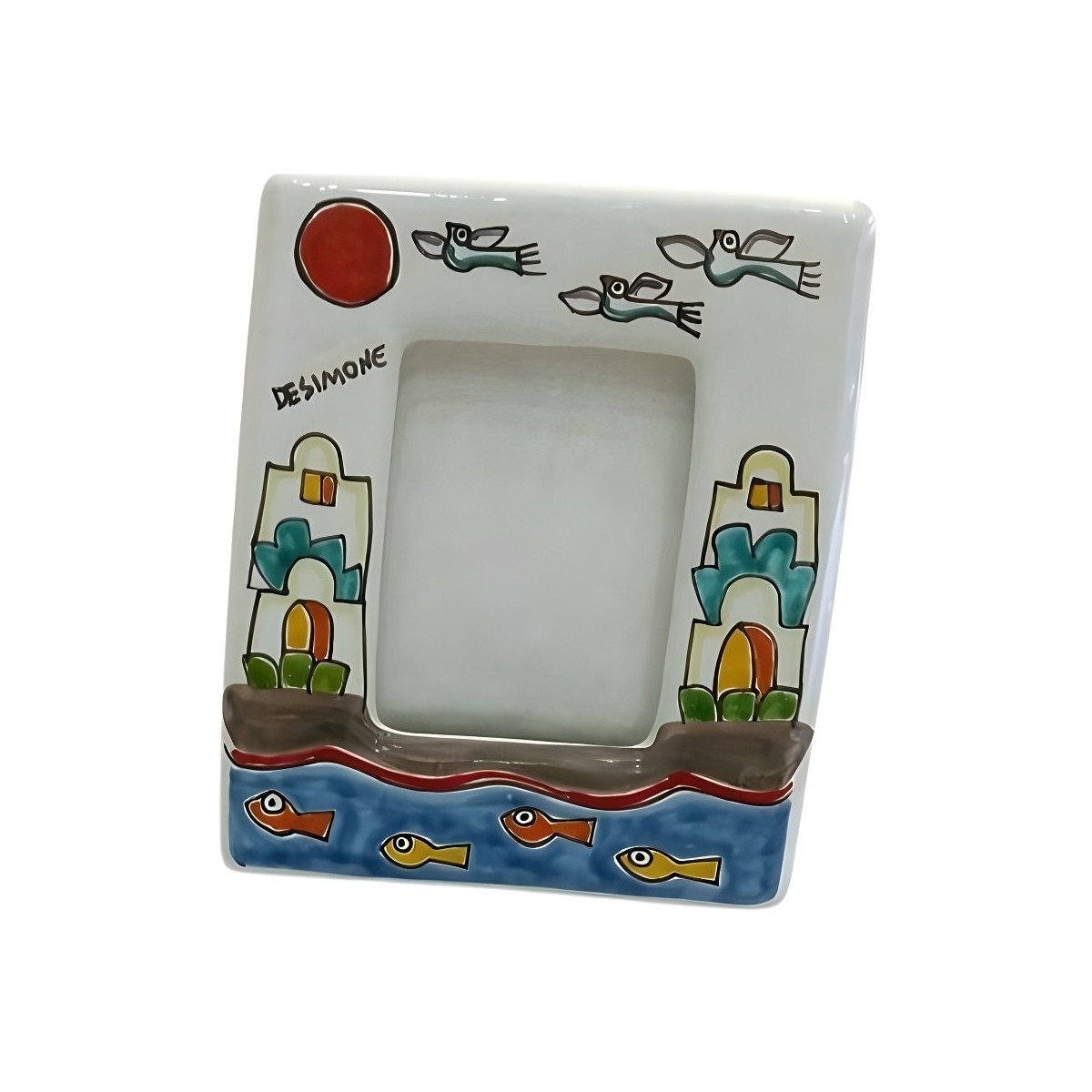 White clay photo holder with hand-decorated frame. It can contain a photo of 9 x 12,5 cm.