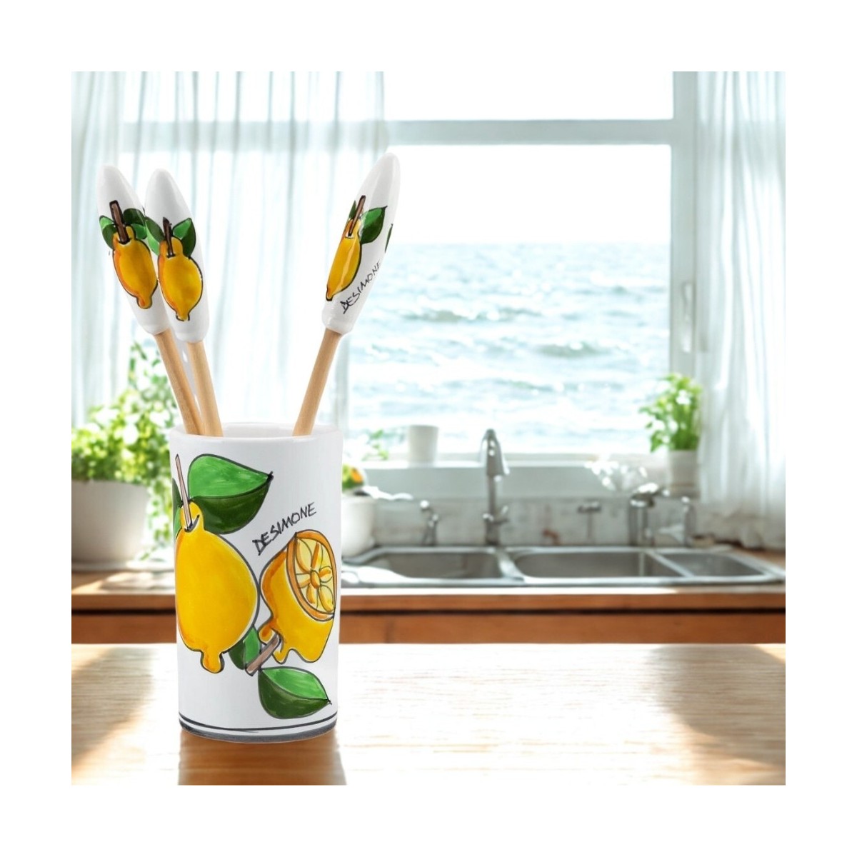 Wooden kitchen utensils with hand-painted ceramic handle, Folk collection, Lemons design. Also available individually (cooking fork, spatula, and cooking spoon) or as a complete set. Utensil holder not included.