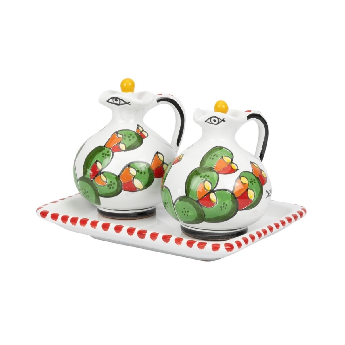 Oil and vinegar set made of ceramic and hand-painted in traditional Sicilian style, Folk line, Prickly Pears pattern.
