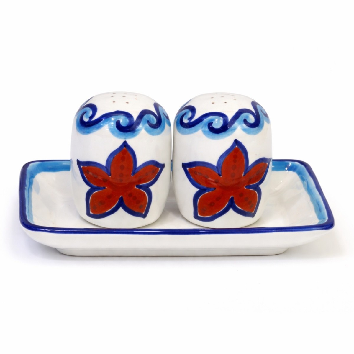 Salt and pepper set made of ceramic and hand painted in traditional Sicilian style with Maestrale pattern, Mangiallegro line.