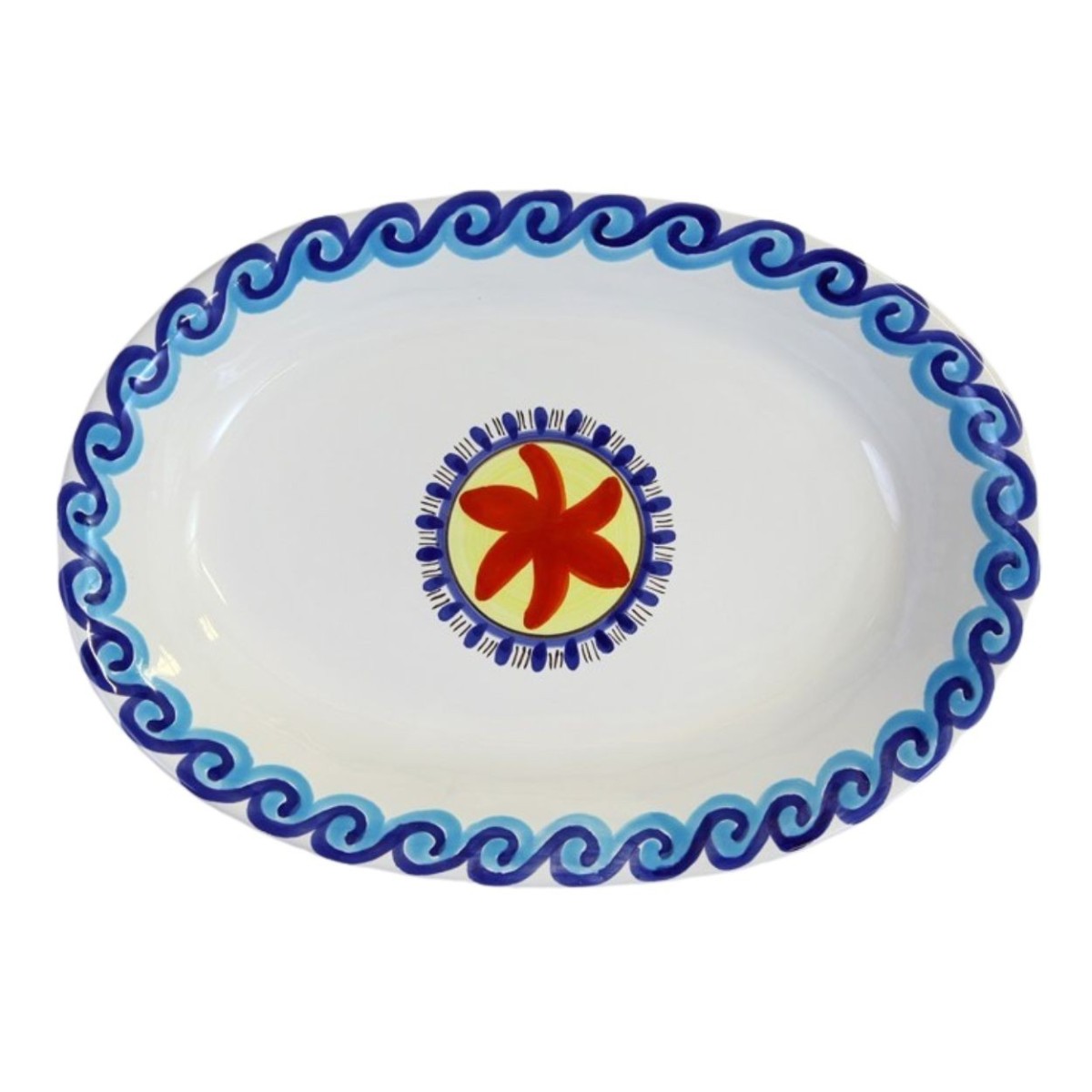 Hand-painted and handcrafted oval serving dish from the Mangiallegro line, Tramontana pattern. Available in three sizes: 25x18 cm, 35x25 cm, 47x34 cm.