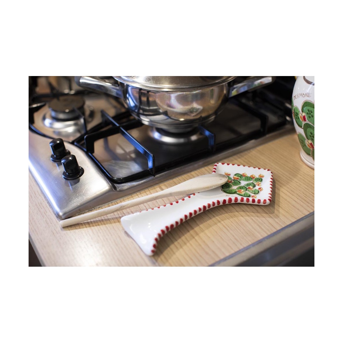 Prickly Pears ceramic spoon rest of the Folk line entirely handmade by our craftsmen. Ideal to keep in the kitchen or on the table, is an accessory that is always useful to have at hand a small space where to rest the utensils that are used during the preparation of dishes or when they are served.