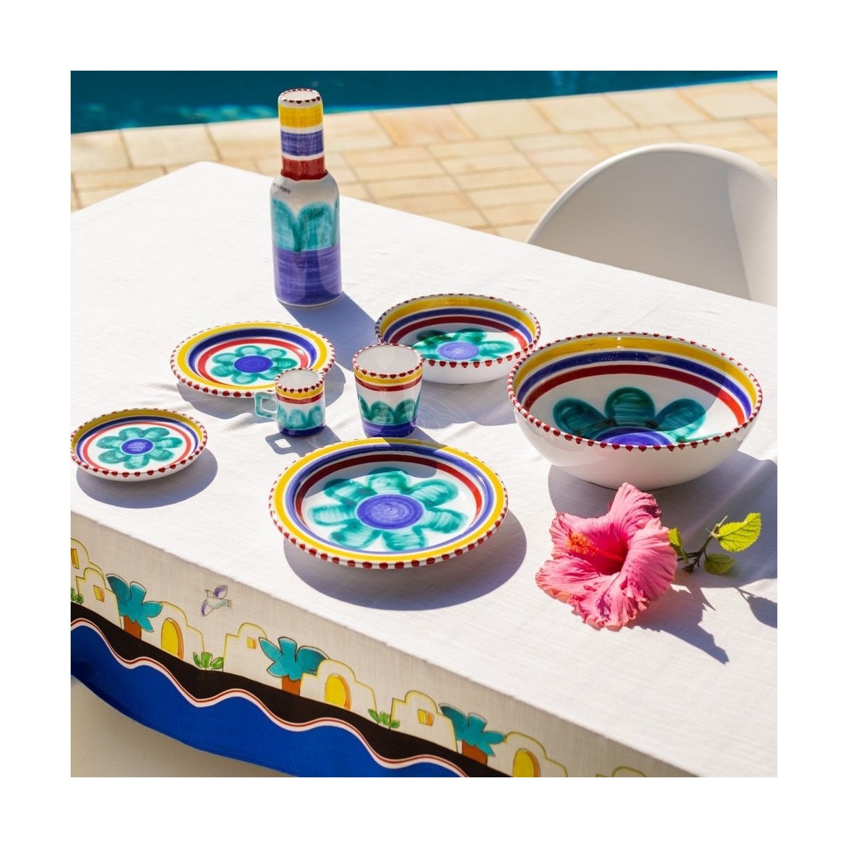 The cheerful and distinctive design recalls the Sicilian landscape and colors, featuring the characteristic shapes of the Dammusi motif, one of the most representative patterns of Ceramiche De Simone. This design, part of the brand’s aesthetic heritage, gives the tablecloth a recognizable and authentic identity.
