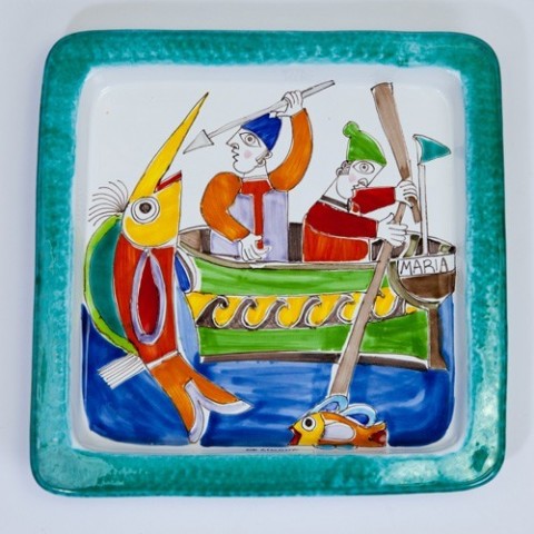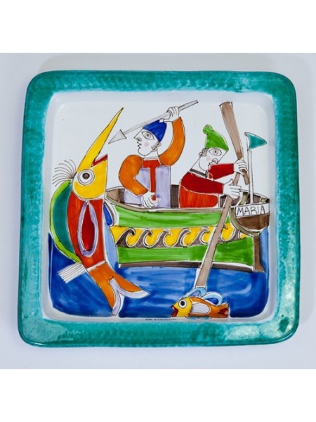 Handcrafted square plate made of ceramic and hand-painted Fishermen from the Folk Line