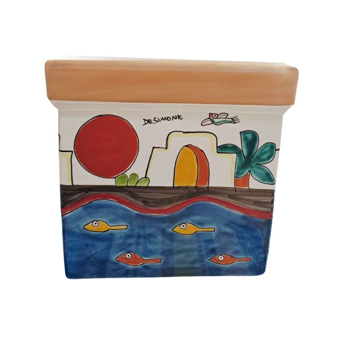 Handmade and hand-painted rectangular ceramic vase from the Mangiallegro line, Dammusi fantasy. Available in different sizes.