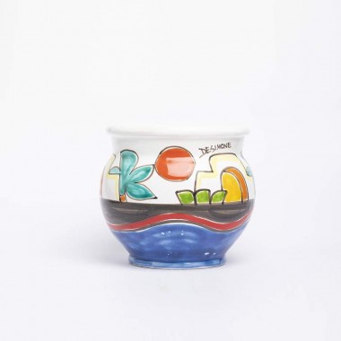 Round ceramic vase, handmade and hand-painted, from the Mangiallegro line, Dammusi collection. Diameter 10 cm, height 13 cm.