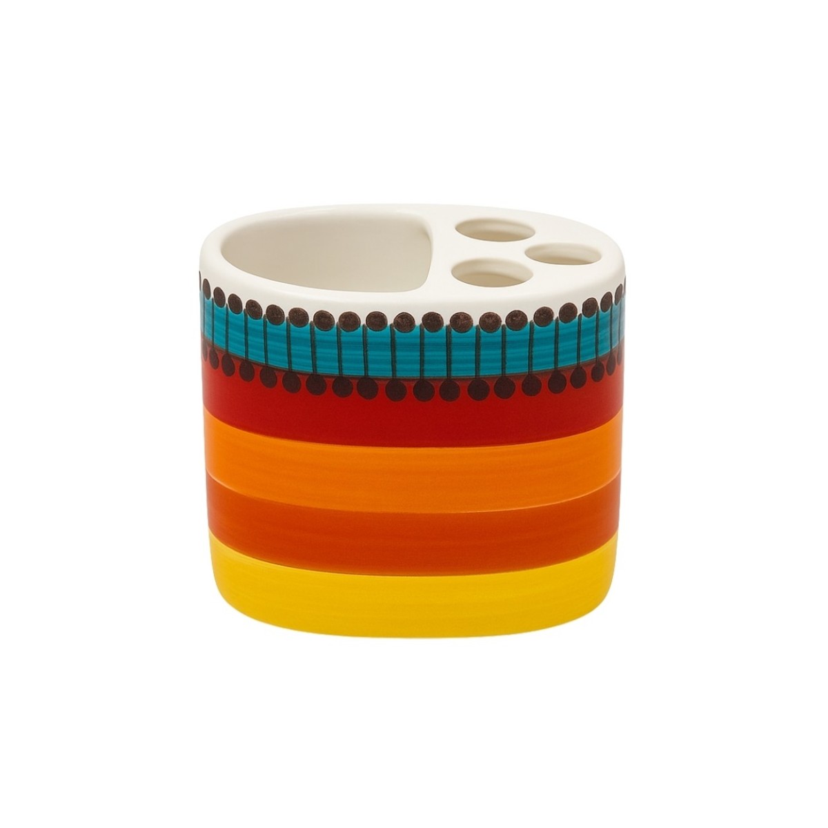 Il suo design esclusivo e colorato, frutto del lavoro manuale di artigiani e artisti, rende il portaspazzolini Pantelleria un accessorio elegante che funge da vero e proprio complemento d'arredo. Ovunque lo posizionerai, saprà di certo farsi notare! Che sia sul lavandino o sopra un mobile, conferirà colore e allegria al tuo bagno, soprattutto abbinandolo ad altre creazioni Ceramiche De Simone con la medesima fantasia per abbellire l'ambiente con un accessorio utile e che fa la sua figura anche alla vista.
