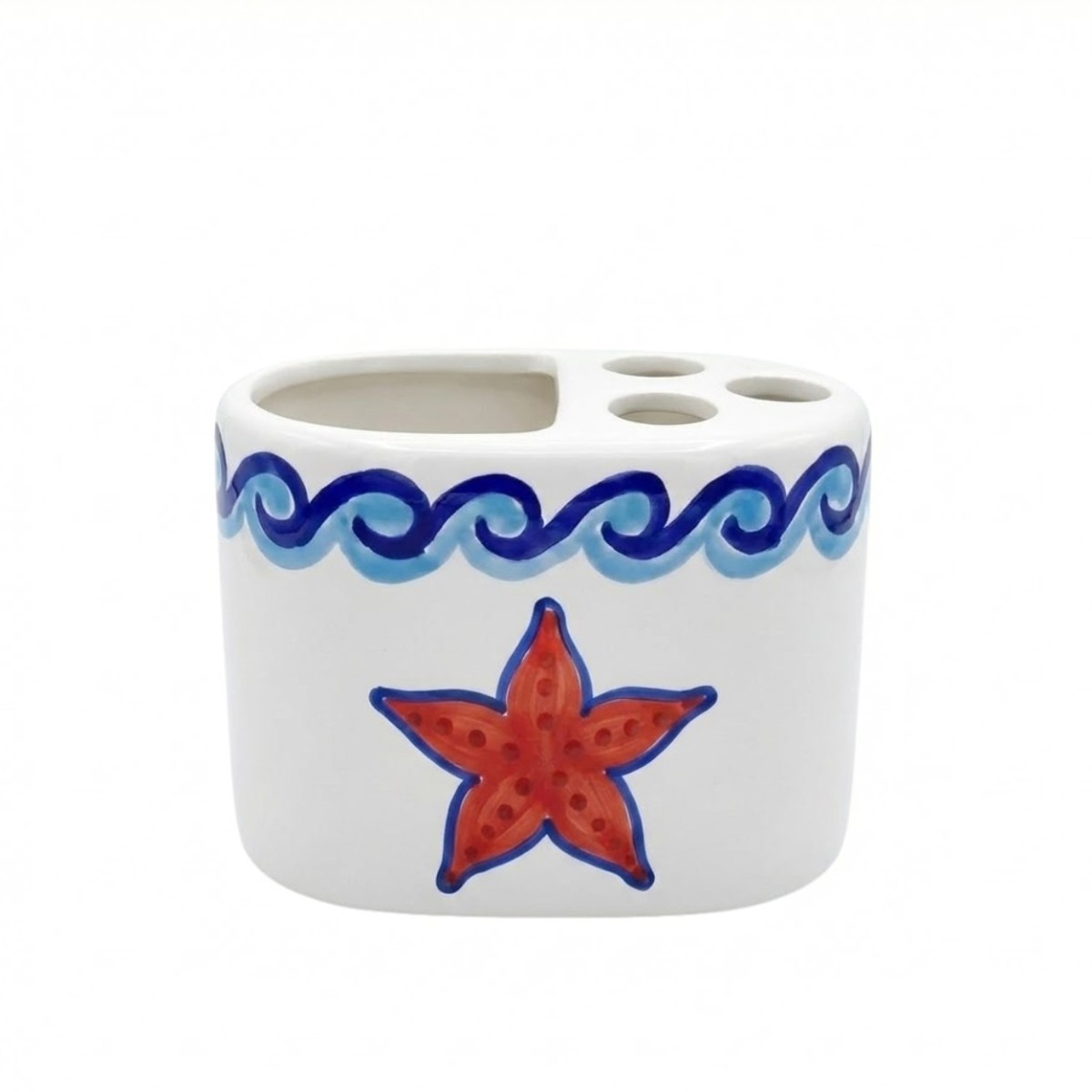 Dispenser in ceramica per spazzolini e dentrificio decorato a mano fantasia Maestrale della linea Mangiallegro