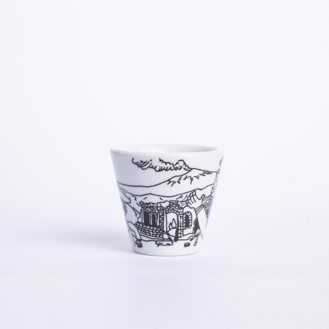 Tazzina da caffè con piattino in porcellana della linea Bianco e Nero, con fantasia ispirata alla città di Taormina.