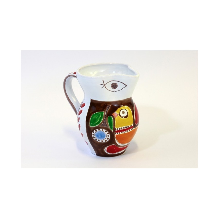 Brocca in argilla bianca realizzata interamente a mano dai nostri artigiani. Ideale non solo per servire bevande come una classica caraffa, ma anche da riporre su una superficie come contenitore (es. per le posate in cucina) od ornamento in cucina e altre stanze della casa. La fantasia ritratta è frutto del lavoro dei nostri artisti che l'hanno decorata a mano, il che la rende un pezzo unico ed esclusivo come ogni creazione De Simone.