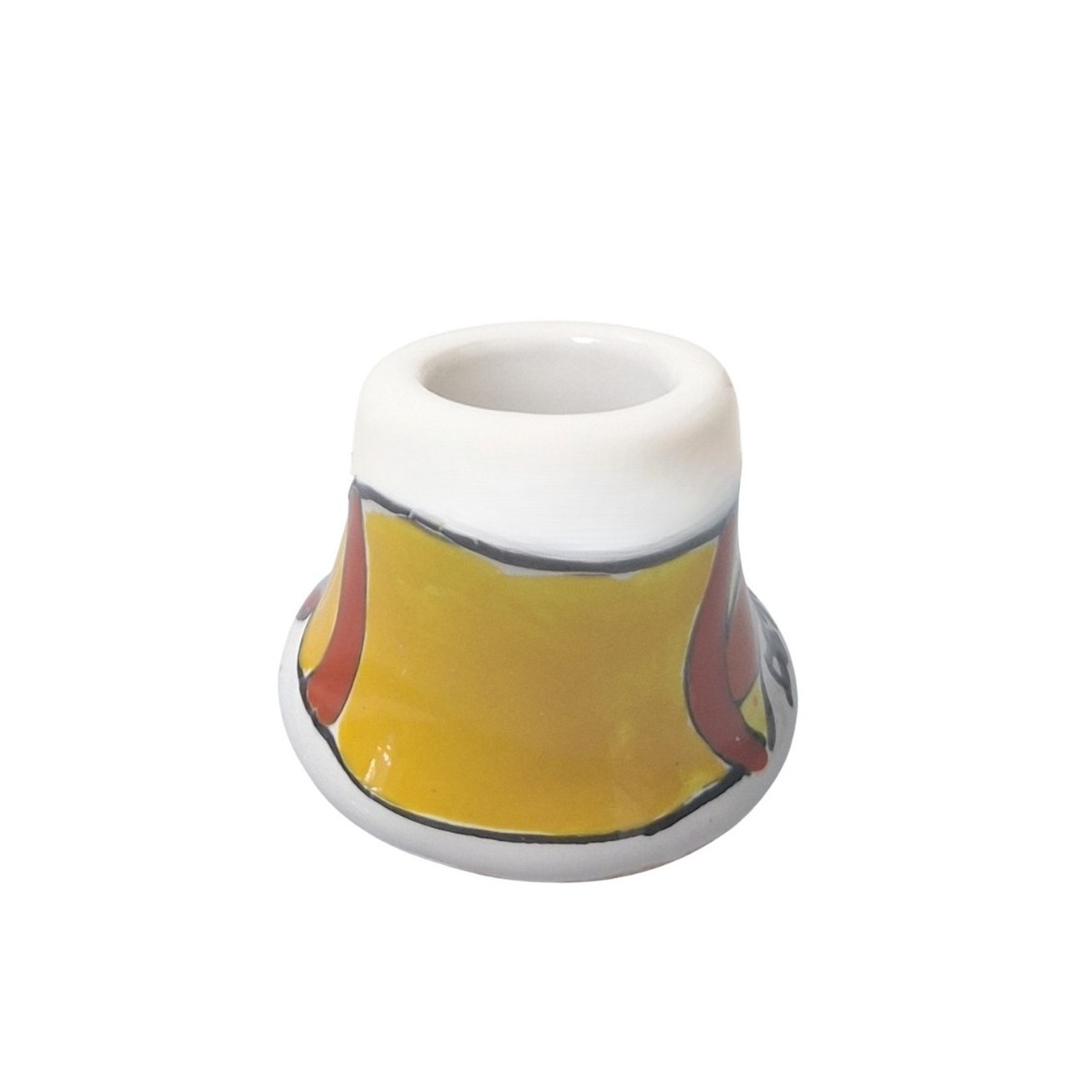 Portacandela in ceramica realizzato interamente a mano dai nostri artigiani. La forma bassa e compatta (alto 3 cm, diametro 5 cm) con foro centrale è pensata per accogliere una candela lunga, trasformandosi in un piccolo punto luce dal carattere deciso per la tavola o per ogni angolo della casa. Il decoro raffigura una vivace campanella stilizzata nei toni del giallo, arancio e rosso: un motivo iconico della fantasia Campanella della linea Folk, che rende questo portacandela un dettaglio allegro e immediatamente riconoscibile.