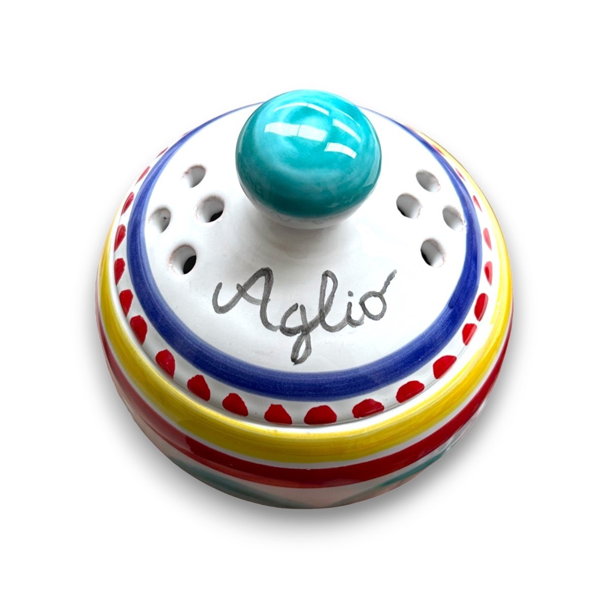 Contenitore con coperchio porta aglio realizzato a mano, linea Mangiallegro, fantasia Alicudi.