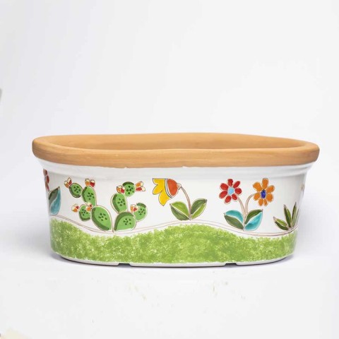 Vaso porta pianta in ceramica, realizzato e dipinto a mano, della linea Folk con fantasia fiori e fichi d'india. Disponibile in tre misure: 23x15 cm, 30x16 cm.