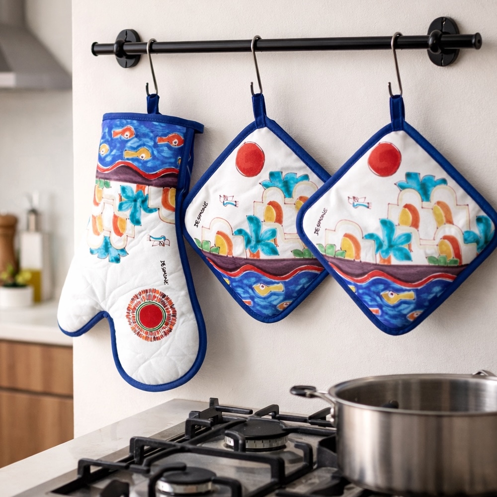 Le presine e i guantoni firmati Ceramiche De Simone portano in cucina il colore di uno dei decori Mangiallegro più amati: Dammusi. Se invece preferisci una fantasia più semplice ma pur sempre iconica, puoi scegliere il nostro Pesce, protagonista indiscusso dei decori Folk.