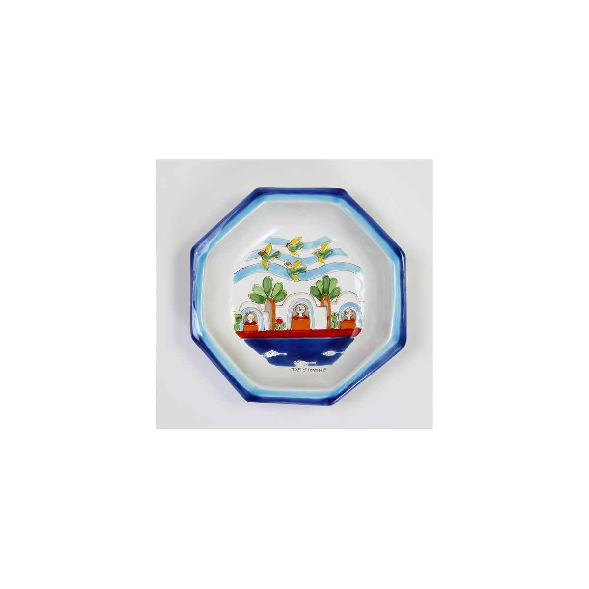 Piatto ottagonale dipinto a mano e realizzato con tecniche artigianali della linea Folk. Disponibile in tre misure: 21x21 cm, 23x23 cm - piatto fondo, 25x25 cm.