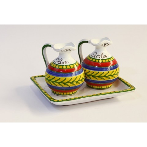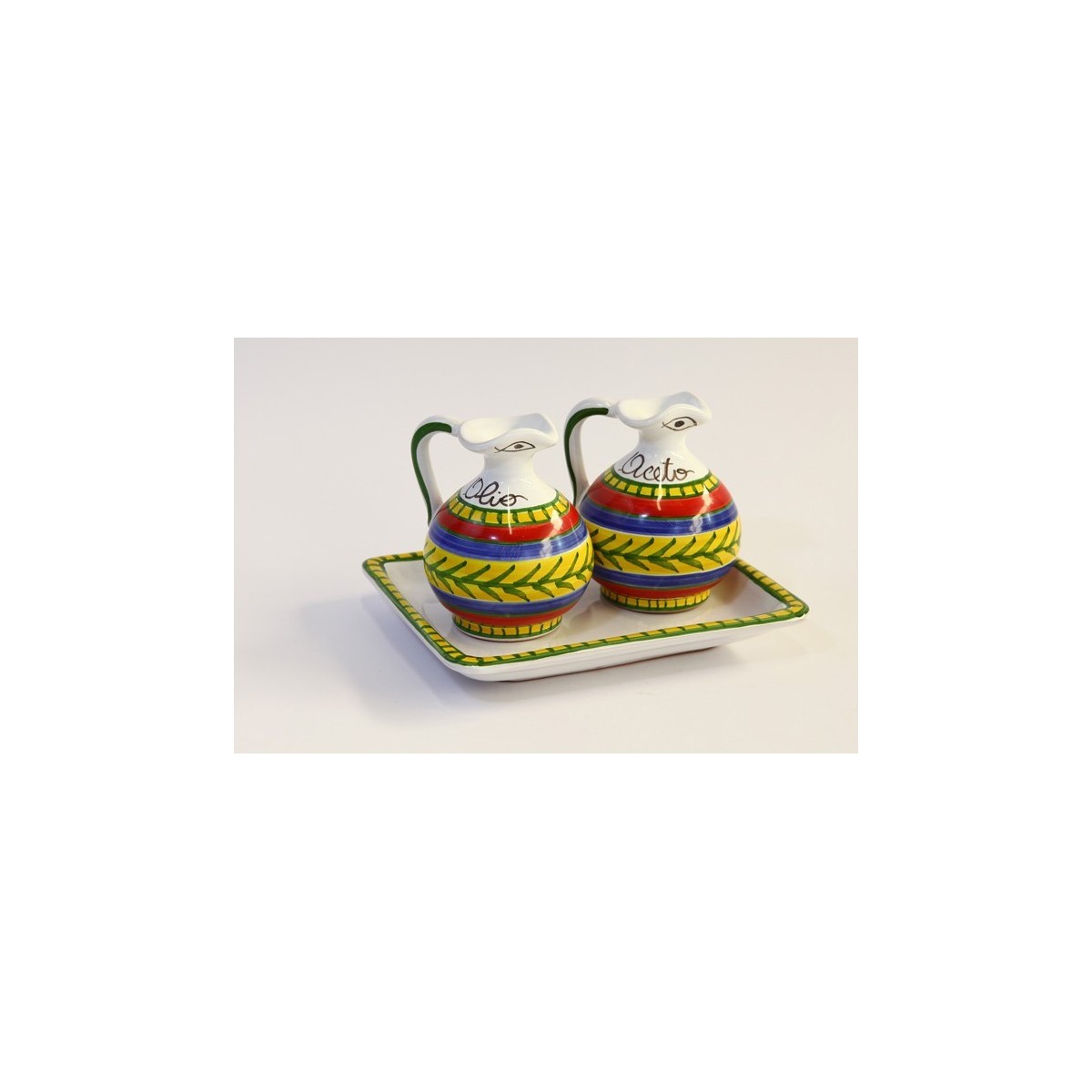 Set olio e aceto realizzato in ceramica e dipinto a mano in stile tradizionale siciliano con fantasia Vulcano, linea Mangiallegro.