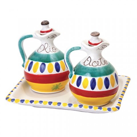 Set Olio e Aceto in ceramica della linea Mangiallegro realizzato interamente a mano dai nostri artigiani. Ideale da tenere in cucina o sulla tavola, è un accessorio che si rivela sempre utile per avere a portata di mano i condimenti più usati, fungendo al tempo stesso da ornamento grazie al design allegro e colorato.