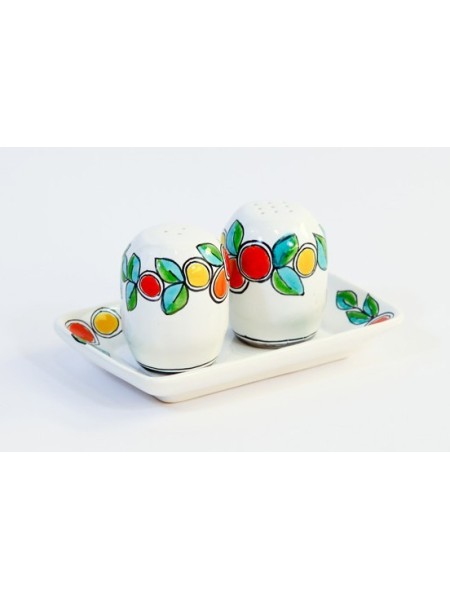 Set Sale e Pepe realizzato in ceramica e dipinto a mano in stile tradizionale siciliano con fantasia Arance e Limoni, linea Mangiallegro.