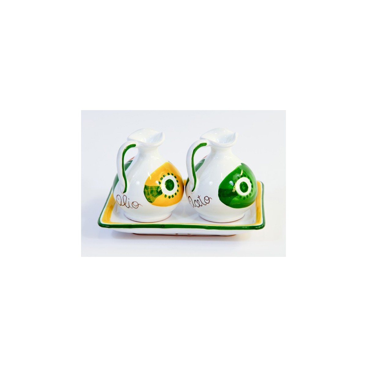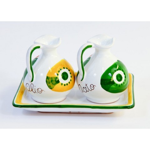 Set olio e aceto realizzato in ceramica e dipinto a mano in stile tradizionale siciliano con fantasia Filicudi, linea Mangiallegro.