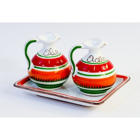 Set Olio e Aceto in ceramica della linea Mangiallegro realizzato interamente a mano dai nostri artigiani. Ideale da tenere in cucina o sulla tavola, è un accessorio che si rivela sempre utile per avere a portata di mano i condimenti più usati, fungendo al tempo stesso da ornamento grazie al design allegro e colorato.