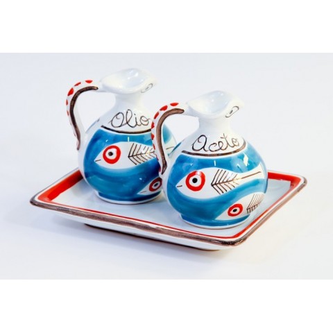 Set olio e aceto realizzato in ceramica e dipinto a mano in stile tradizionale siciliano con fantasia Itaca, linea Mangiallegro.