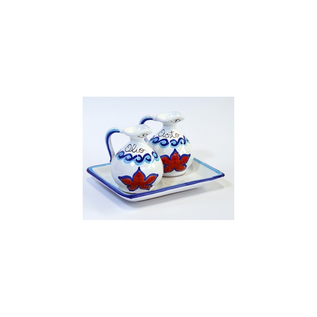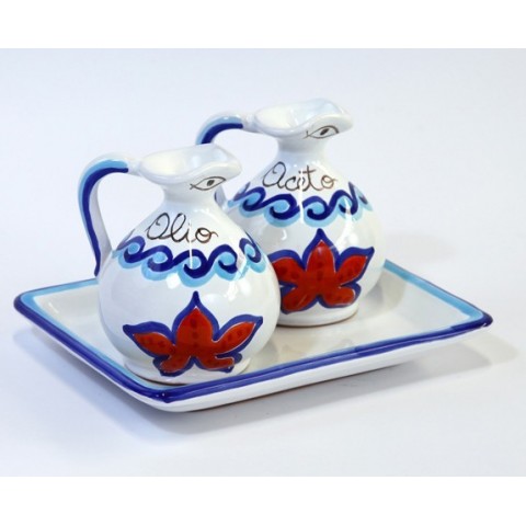 Set olio e aceto realizzato in ceramica e dipinto a mano in stile tradizionale siciliano con fantasia Maestrale, linea Mangiallegro.