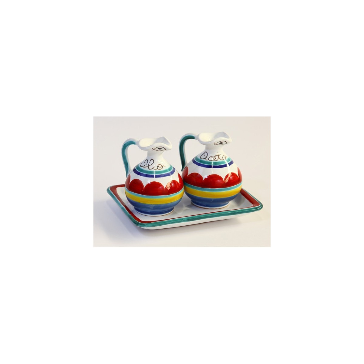 Set Olio e Aceto in ceramica della linea Mangiallegro realizzato interamente a mano dai nostri artigiani. Ideale da tenere in cucina o sulla tavola, è un accessorio che si rivela sempre utile per avere a portata di mano i condimenti più usati, fungendo al tempo stesso da ornamento grazie al design allegro e colorato.