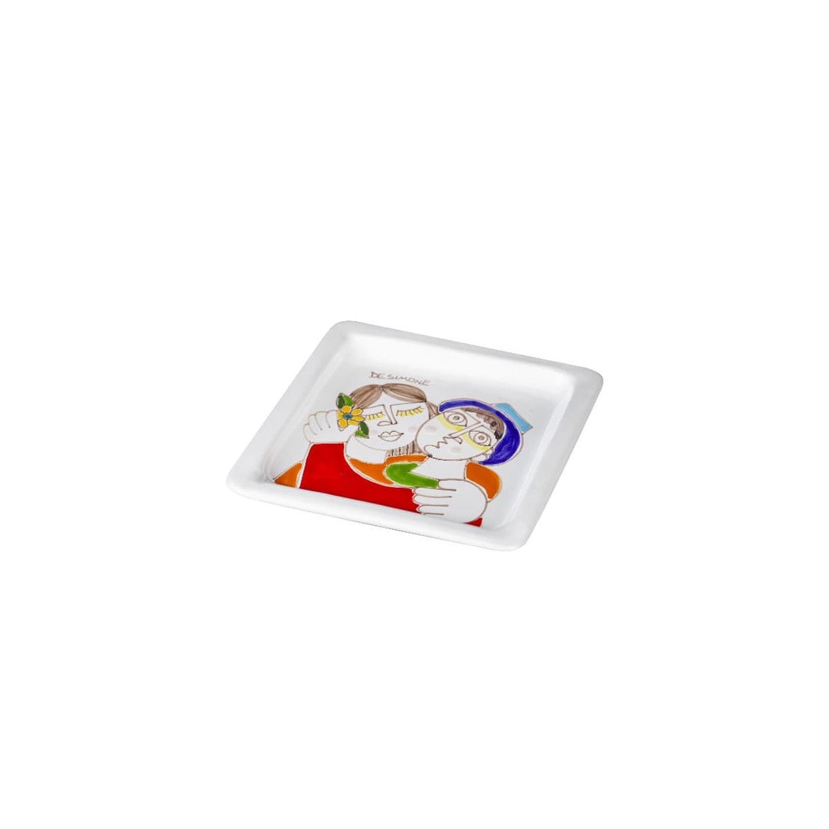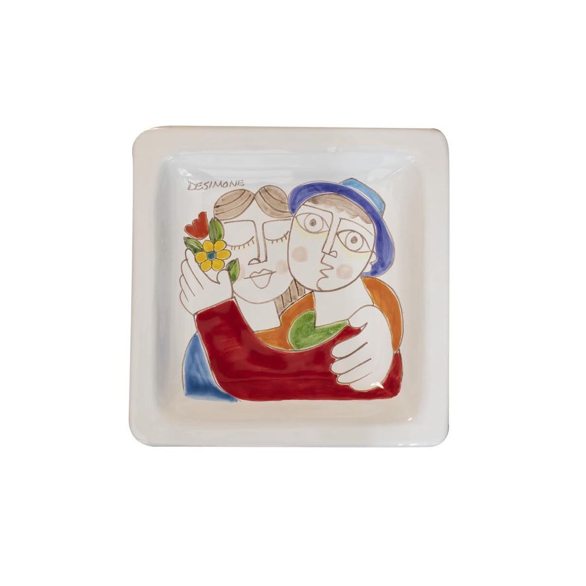 Piatto quadrato in ceramica realizzato artigianalmente e decorato a mano con fantasia "Fidanzati", perfetta idea regalo per il proprio innamorato.