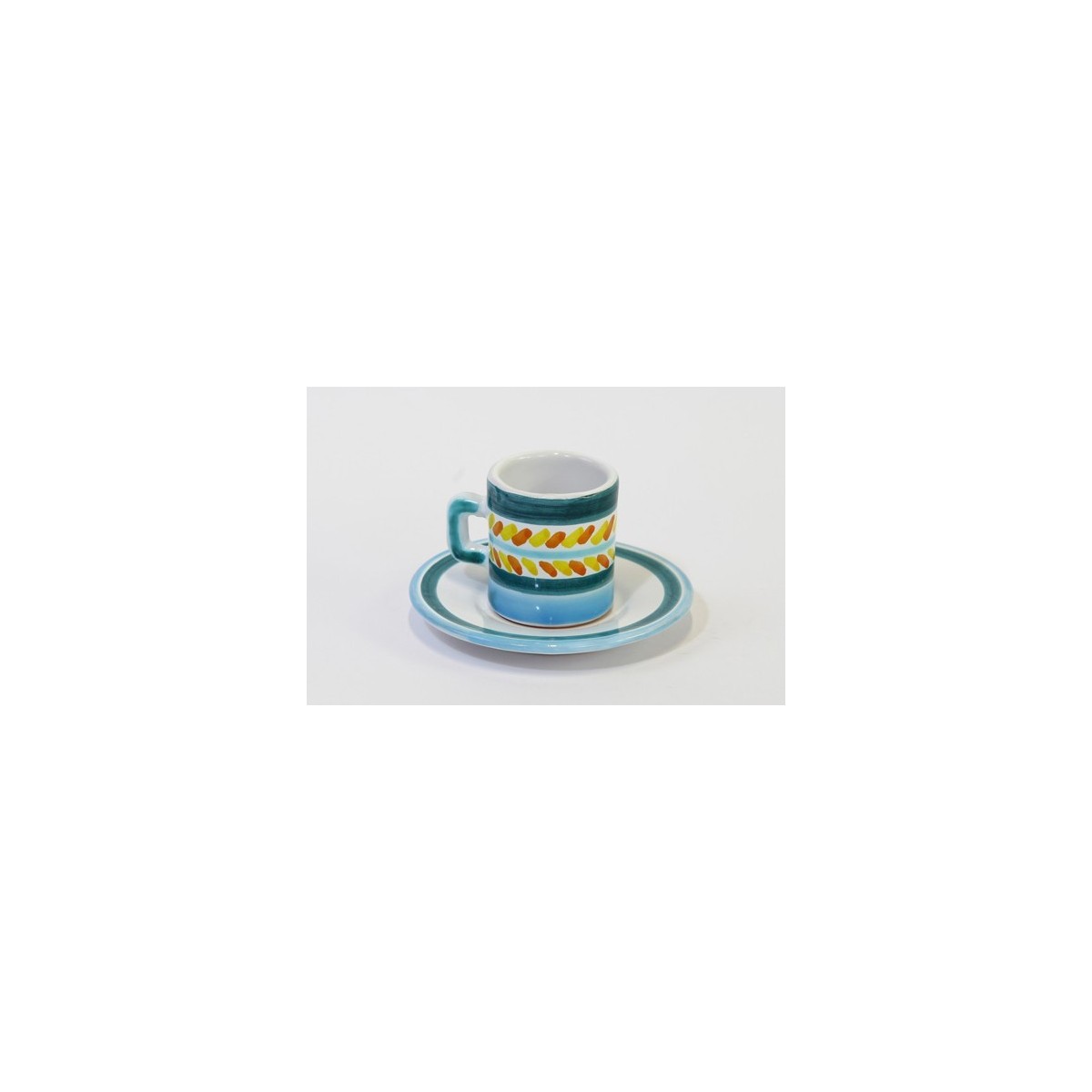 Set tazzina da caffè cilindrica con piattino in ceramica, realizzato e dipinto a mano, della linea Mangiallegro con fantasia Segesta.