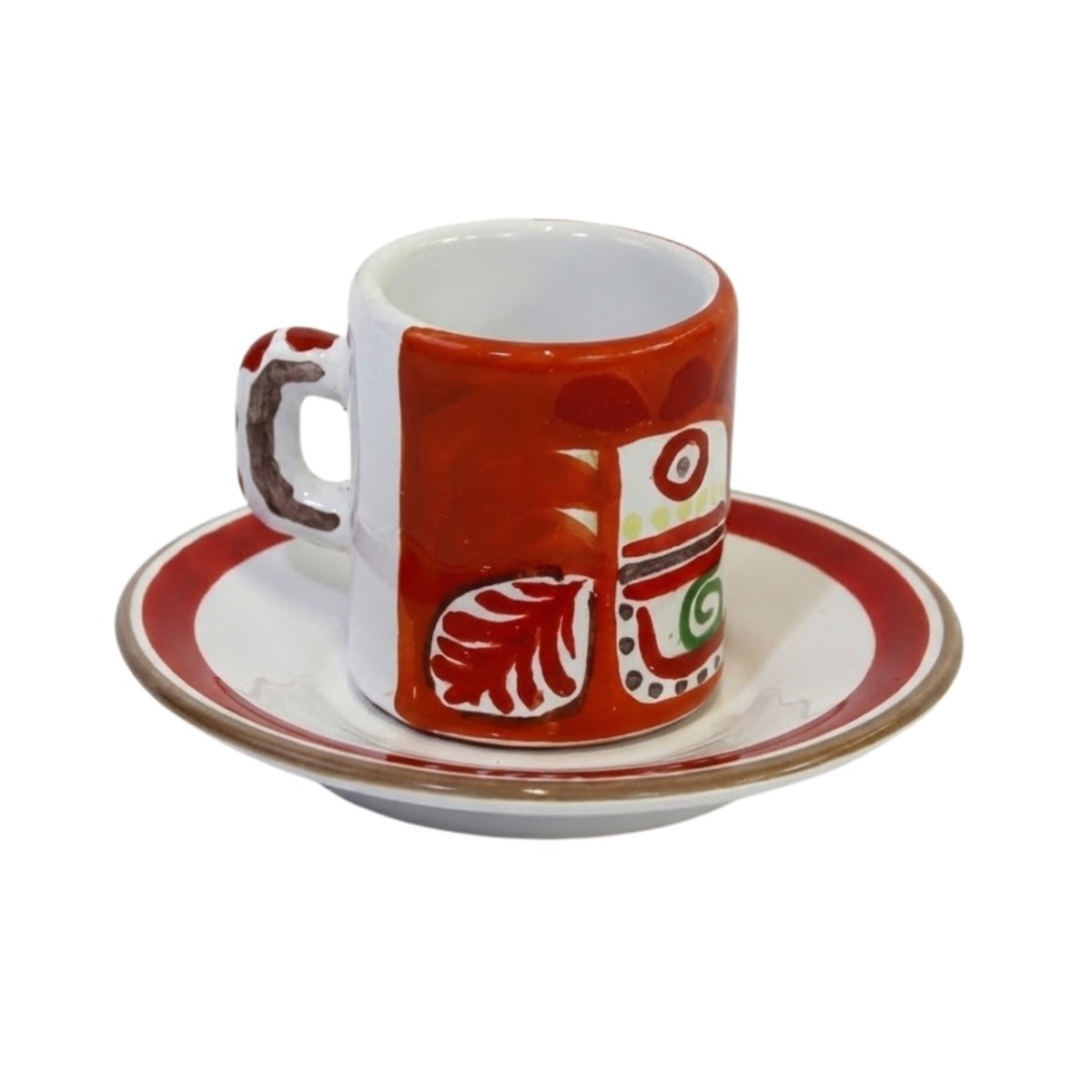 Set della linea Mangiallegro composto da tazzina da caffè e piattino realizzati interamente a mano dai nostri artigiani.
