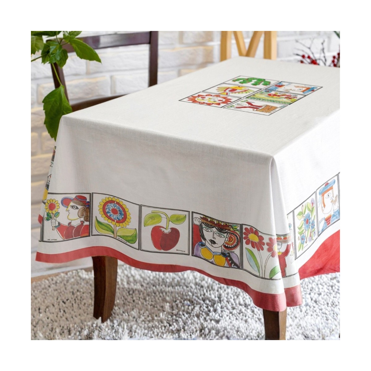 Tovaglia rettangolare in policotone, resistente ai liquidi, fantasia Patchwork, disponibile in due dimensioni: 220 x 155 cm e 270 x 155 cm. Firmata Ceramiche De Simone.