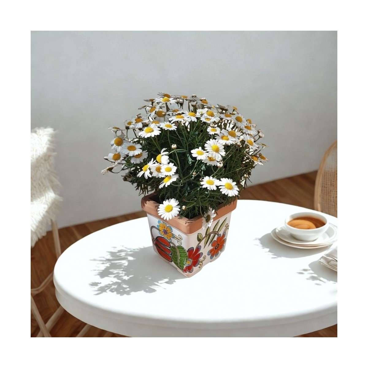 Vaso quadrato in ceramica, realizzato e dipinto a mano, della linea Folk. Disponibile in diverse misure.